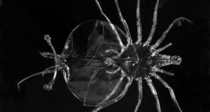 I probably got less sleep on the grad school trip than at any comparable span of time in my life, despite being a lifelong expert in insomnia. My group was aiming to catch larval fish; we used several different methods, the main one being the boat’s huge frame trawl. This was an enormous net, maybe 40 feet long,that tapered down to a PVC barrel about 3 feet long, with mesh inserts. All the larger creatures washed out of the net and small, planktonic creatures were caught in the barrel. We caught miniscule slivers of baby fish, tiny speckled octopi the size of pencil erasers, the transparent larvae of lobsters (looking like weird extraterrestrial spiders, fragile as wet tissue paper– opening photo). One day we passed the tattered remains of a makeshift raft, probably from one of the groups of desperate Haitians who were risking their lives in attempts to float to America at the time. It was mostly submerged and consisted of old inner tubes, pieces of coolers, part of a box spring, and other junk. We never knew what happened to the poor souls who set out on such a terrifying conveyance.